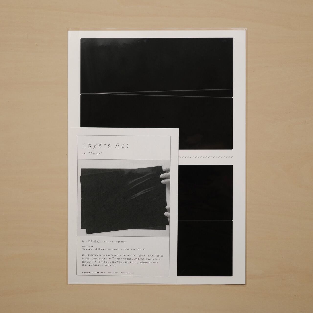 21_21 DESIGN SIGHT 企画展「AUDIO ARCHITECTURE:音のアーキテクチャ展」に出展した映像作品「Layers Act」の撮影に使用したレイヤーのセットです。重ね合わせることで、映像の中に登場した視覚効果を体験することができます。