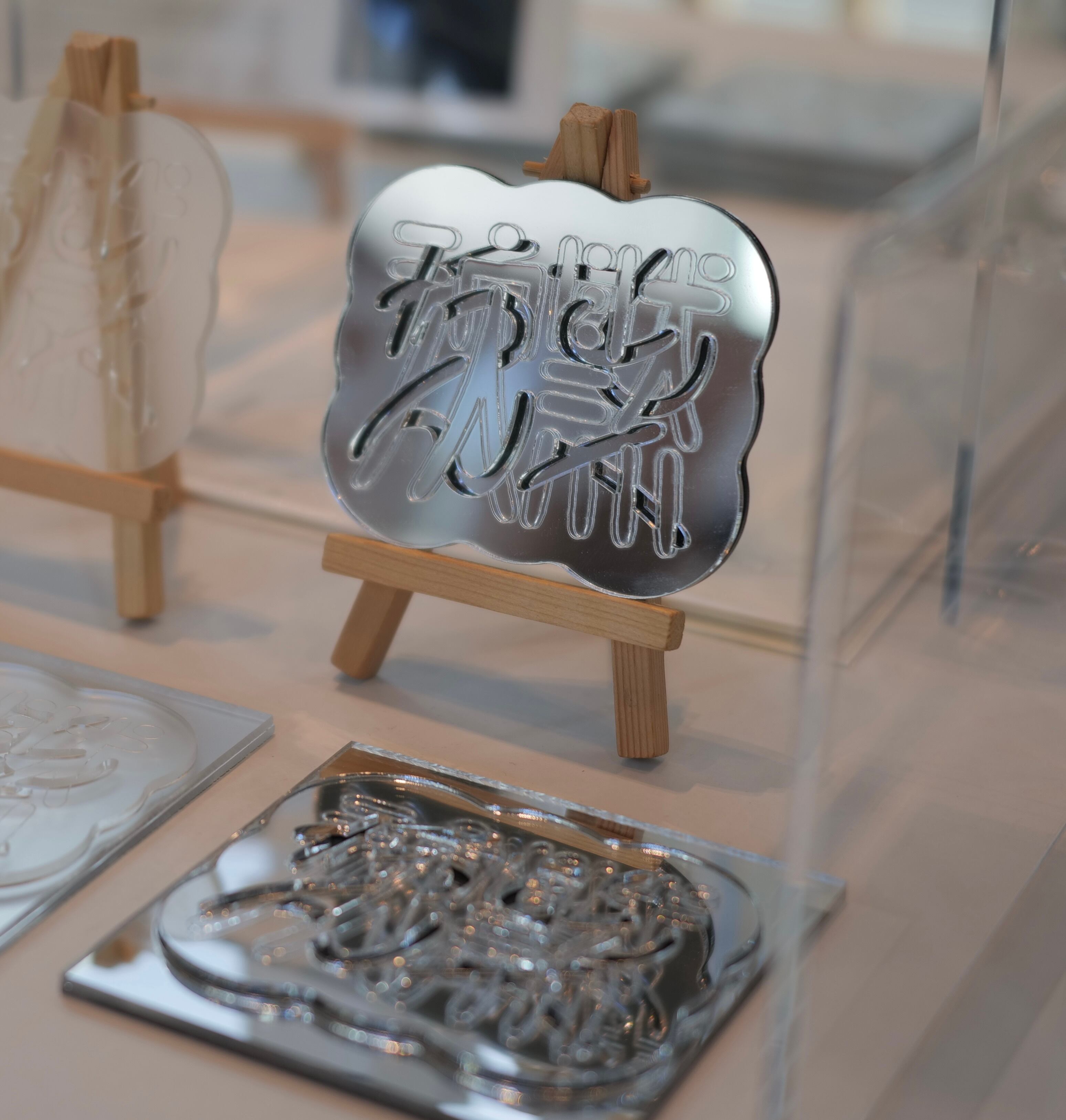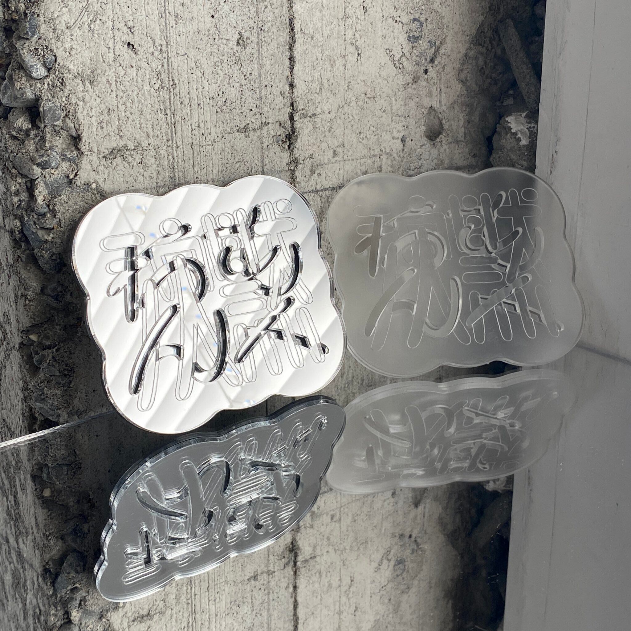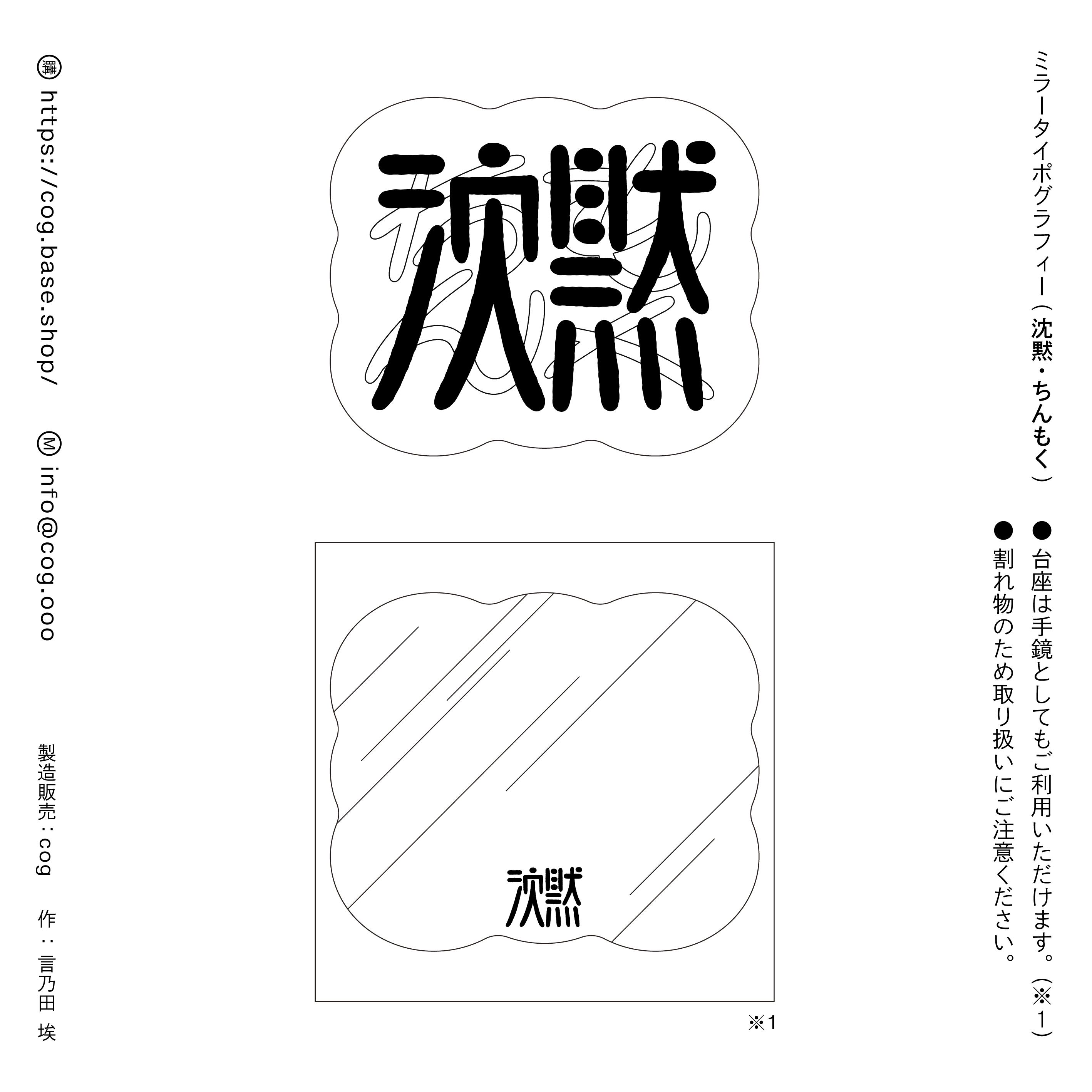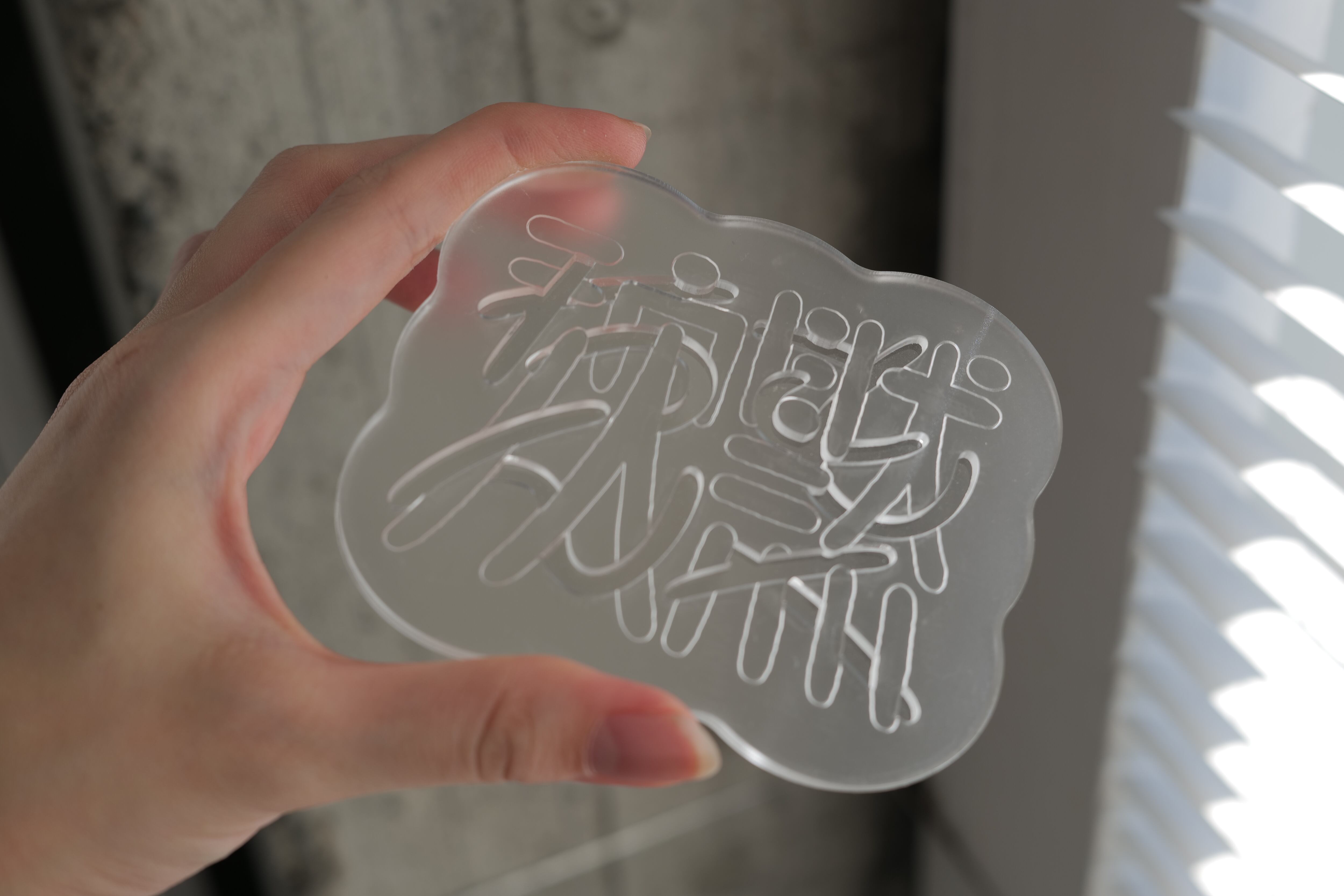 グラフィックデザイナー・言乃田 埃による作字デザイン「沈黙・ちんもく」をアクリル板をカット・積層して立体作品化。